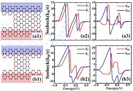 As already mentioned in Section 2, the Seebeck coefficient is determined by the transmission coefficient, and only the electrons within several around the Fermi level contribute to the Seebeck coefficient. In a previous study [58], the authors found that the conductance plateau contributed from the quasi-flat-edge band can be decreased by notching atoms from the zigzag edges of the ribbon. Here, we plotted the Seebeck coefficients as a function of Fermi energy when notches were considered on the ribbon edges. Firstly, we considered a square notch on one edge of the ribbon (see Figure 5(a1)). The peak heights of the Seebeck coefficients only exhibited a very small change compared with the results shown in Figure 3. For example, the peak heights in Figure 5(a2,a3) are and , which are almost the same as that in Figure 3. In Figure 5(b1−b3), we show the spin-dependent Seebeck coefficients for the ribbon with notches on both edges. The constrictions in the scattering region affect the scatterings and suppress the transmission contributed from the edge states. The transmission in the energy region (see Figure 2c) becomes zero due to the notches on the edges. It is noted in Figure 5(b2) that the peak heights of spin-dependent coefficients are largely enhanced. For example, the positive peak heights for spin-up and spin-down coefficients are and , respectively, which are largely enhanced compared with the results shown in Figure 3a and Figure 5(a2). We can also see that the spin and charge coefficients shown in Figure 5(b3) are largely enhanced by modulating the edge transports on both edges of the ribbon.