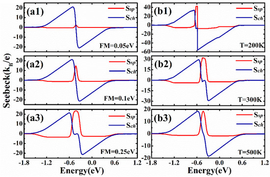 The exchange splitting and temperature have been chosen to be M = 0.184 eV and , respectively. Here, we consider the effects of exchange splitting strength and temperatures. In Figure 6(a1−a3), we justify the value of exchange appropriately, and three values of exchange splitting, M = 0.05 eV, 0.1 eV, and 0.25 eV, are considered. This is useful for future experimental studies, because other stronger or weaker ferromagnets may be chosen in the experiments. We can see that very small changes are found in charge Seebeck coefficients when we change the exchange splitting strength. The peak heights of the charge Seebeck coefficient are around for all the exchange splitting strengths. However, it is noted that the spin Seebeck coefficients are changed greatly due to the change in exchange splitting strength. We can see in Figure 6(a1−a3) that the spin Seebeck coefficient is very small when the exchange splitting is very small. When the exchange splitting , the spin Seebeck coefficient is larger than . This means that we do not need very strong ferromagnets in the experiments, and this theoretical prediction can be realized in future experimental studies. The temperature can also be expressed as T = 424 K, and we extend it to T = 200 K, 300 K, 500 K. We can see that the spin-dependent Seebeck coefficient is larger when we have a lower temperature; for example, the peak heights for T = 300 K is around (see Figure 6(b2)), which is larger than that of Figure 4(b3). For a higher temperature T = 500 K, the peak heights of Seebeck coefficients decrease slightly. It is no doubt that the device can be realized at room temperature.