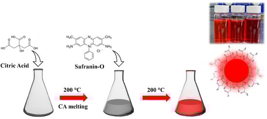 The first step in obtaining red-emitting C-dots was to add safranin O to the molten citric acid. This process has the advantage of allowing the safranin O to be dissolved in a liquid phase and thus obtaining a more homogeneous dispersion and also facilitating the insertion of the dye into the matrix. Once exceeded the melting-point temperature, 150 °C, CA dehydrates and polymerizes to form a carbonized structure whose carbonization degree is controlled through temperature and reaction time []. On the contrary, the higher thermal stability of the dye preserves SO from thermal degradation up to 300 °C (see Figure S1 in Supplementary Information with TGA and DSC of CA, SO, and the combination of the two reagents)