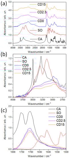 FTIR absorption spectroscopy has been used to investigate the structural change induced by increasing the reaction time. Figure 3a shows the FTIR absorption spectra of five different compounds: CA and SO precursors and C-dots sampled at three reaction times (CD0 (0 min), CD2.5 (2.5 min), and CD15 (15 min)). The main bands of SO displayed at 3150 and 3325 cm−1 are attributed to the N-H symmetric and asymmetric stretching vibrations []. C-H stretching of the SO methyl group is located in the region between 2800 and 3000 cm−1 and contributes to the enlargement of high-frequency bands towards lower wavenumbers (Figure 3b). In the same spectral range, CA exhibits two characteristic bands at 3498 cm−1 and 3295 cm−1 along with minor contributions at 3222 and 3450 cm−1 (Figure 3b) that are assigned to the OH stretching from carboxylic groups []. Two broad bands at 3158 and 3450 cm−1 characterize the vibrational structure of the C-dots and are due to the large amount of OH groups formed in the pyrolyzed carbon structure and the presence of NH groups stretching, respectively. In addition, CH stretching is recognizable in the peaks at 2906 and 2980 cm−1 whose intensity decreases with the reaction time. In the region between 1500 and 1800 cm−1, SO shows two main peaks at 1641 and 1609 cm−1 that are correlated to in-plane H-N-H and C=C stretching in phenazine rings []. The other band with a maximum at 1529 cm−1 still stems from C=C stretching vibration in phenazine rings (Figure 3c). CA, in its anhydrous form, displays a doublet at 1754 and 1744 cm−1 and a further band at approximately 1703 cm−1 originating from the C=O stretching mode of the carboxyl group.