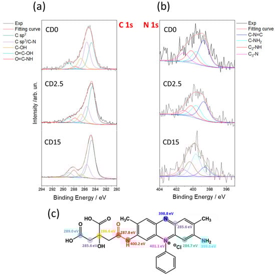 The C-dot composition was determined by X-ray photoelectron spectroscopy (XPS) using a custom-designed UHV system equipped with an Omicron electron analyzer, working at a base pressure of 10−10 mbar. A non-monochromatized Al Kα X-ray source (1476.6 eV) was used to acquire the core-level photoemission spectra. Single spectral regions were collected using 0.1 eV steps, 0.5 s collection time, and 20 eV pass energy. The C 1s region was separated into five chemically shifted components, although not all of them are present in all the samples. The Doniach–Sunjic shape was used for the sp2 component, whereas symmetrical Voight functions were used for the sp3 component and the C-O and C-N functional groups. In the case of the N 1s region, four chemically shifted components were considered, and symmetrical Voight functions were used for all of them. The same full width at half maximum (FWHM) was used for all the components in the same region.
