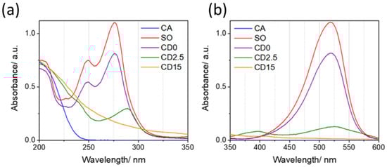 Figure 5 shows the UV-Vis absorption spectra of CA, SO, and C-dots after reaction at different times. The spectra are shown, for the sake of clarity, in two wavelength ranges: 200–350 (Figure 6a) and 350–600 nm (Figure 6b). CA shows one intense band at high energy (typically <250 nm) due to the characteristic π → π* electronic transition in the carbonyl group and no other absorption bands. This spectral feature is clearly shared with SO and C-dots as a result of transitions in the conjugate states of benzene moieties and aromatic states, respectively. SO π–π* transitions also extend to 248 and 276 nm bands []. Another absorption band (Figure 6b) in SO is centered around 520 nm and is attributed to intramolecular charge-transfer (ICT) n → π* transitions involving phenazine nitrogens [,,].