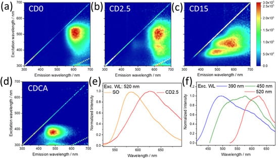 3D fluorescence spectra (emission (x-scale), excitation (y-scale), intensity (false colour scale)) of C-dots at different reaction times: 0 (a), 2.5 (b), and 15 min (c), respectively. The 3D fluorescence spectra of C-dots by CA only (CDCA), after 15 min of reaction time (d). Normalized photoluminescence spectra of SO and CD2.5 under excitation at 520 nm (e). Normalized photoluminescence spectra of CD15 as a function of excitation wavelength (390, 450, 520 nm) (f).