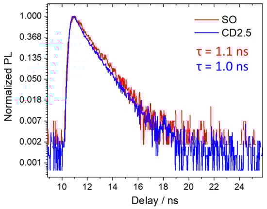 The red emission PLQY of the obtained CD2.5 under excitation at 532 nm is 4%, which is smaller than the SO QY value (16%). This reduction in QY is most likely due to the contribution of the non-emissive core to the overall optical absorption. Apart from this effect, the SO dye structure and its stability are maintained even after the formation of a carbonaceous shell which, eventually, does not significantly affect the radiative and non-radiative recombination of the embedded dye. Figure 7 displays the time-resolved photoluminescence spectra that confirm the incorporation in the carbon dots matrix. Indeed, the lifetimes of SO and CD2.5 are very close when analyzed with a single exponential decay law (τSO = 1.1 and τCD2.5 = 1.0 ns), although CD2.5 lifetime results are slightly affected by the matrix environment.