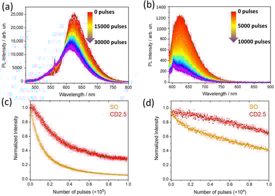 Spectrally resolved photoluminescence of SO as a function of laser pulses under prolonged irradiation, (a) λex = 532 nm and (b) λex = 260 nm. Photobleaching kinetics of SO (orange dots) and CD2.5 (red dots) under λex = 532 nm (c) and λex = 260 nm (d).