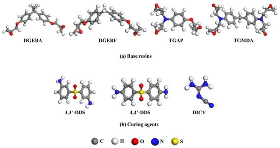 Molecular structures of (a) base resins (DGEBA, DGEBF, TGAP, TGMDA) and (b) curing agents (33DDS, 44DDS, DICY) that compose epoxy resin systems.