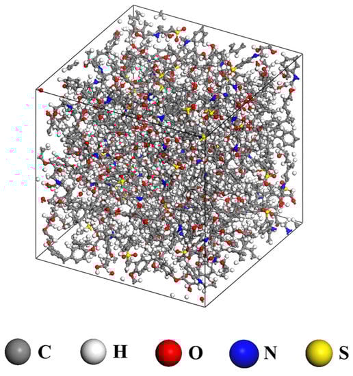 After building the crosslinked models, NVT MD simulations were performed for 1 ns at 298.15 K for the equilibrium model, and other isothermal–isobaric (NPT) simulations were performed for 1 ns at 298.15 K for geometry optimization (Figure 2). The density was obtained by averaging the values during the last 1 ns of the MD simulations. The other structural analysis, namely, calculating the free volume ratio, was performed using the Connolly surface present within 1.4 Å radius. The free volume was divided by the total volume of the model to compare the relative free volume sizes of the epoxy resin systems.