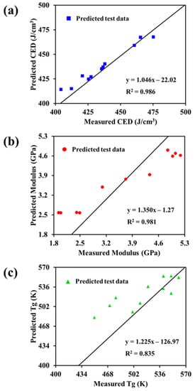 The ANN model was further verified through linear regression analysis. The results are shown in Figure 5. Linear regression analysis was performed by determining the regression line between the predicted properties and the calculated properties of the datasets. For a perfect correlation between the output data of the prediction model and the target value, the slope of the linear regression should be 1 and the y-intercept should be 0. Figure 5 shows that the data predicted by the CED, modulus, and Tg ANN models presented a linear correlation with the calculated data. The determination coefficients (R2) were 0.986, 0.981, and 0.835 for the CED, modulus, and Tg ANN models, respectively, indicating that the developed prediction model is highly accurate.