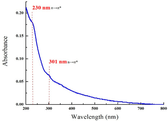 Figure 3 shows the UV–Visible absorption spectrum of the aqueous solution of GO nanosheets. The observed characteristic peak (230 nm) and shoulder (301 nm) are assigned to π→π* transition of aromatic C=C matrix of GO and n→π* transition of the oxygen lone pair of electron of the carbonyl group (C=O) in GO, respectively [38,40].