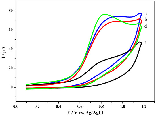 Figure 7 describes the CVs of 3.5 mM of NIC in 0.10 M Na2SO4 (pH 8.0) containing a bare GCE (a), the Nq/GCE (b), the GO/Nq/GCE (c), and the GO/GCE (d) at a scan rate of 100 mV/s. The results showed that the bare GCE (Figure 7, curve a) gave a poorly broad oxidation peak near 0.77 V (vs. Ag/AgCl) is ascribed to NIC oxidation. Meanwhile, in the case of Nq/GCE, GO/GCE, and GO/Nq/GCE, the peak potential of NIC oxidation appeared to be 0.85. 084 and 0.83 V, respectively, as exhibited in Figure 7 (curves b and c). The interpretation of the negative shift in the peak potential is due to the presence of both GO nanosheets and Nq films, which acted as electrocatalysts toward NIC oxidation, which accelerated the electron transfer rate. On the other hand, the usage of GO/Nq/GCE led to the enhancement and increase in the oxidation peak current of NIC by four-fold, compared to that which appeared at bar GCE. This is because the unique conjugation between the Nq film and nanosheets of GO increased the electroactive surface area that catalyzed NIC oxidation [26,27,28]. The absence of voltammetric response (peak) in the cathodic scan is attributed to the irreversibility of NIC oxidation as supported by the literature [24,50].
