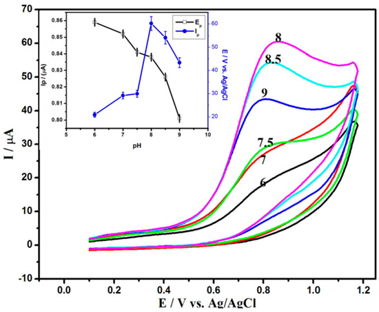 The pH of the supporting electrolyte is considered an essential factor for the peak current (Ip). By examining the change of pH values from (2.0 to 9.0), it was observed that there are no current responses of NIC at a pH lower than 6.0. However, by increasing the pH value, the anodic peak of NIC increased until a maximum value was observed at pH 8.0, and then it decreased, as shown in Figure 8. This agrees with previous papers that prove that a neutral or slightly alkaline media were appropriate in the voltammetric determination of NIC [5,24]. On the other hand, the potential shifted towards less positive values by increasing the pH values, demonstrating proton participation in the oxidation process [51]. A plot of the oxidation peak potential vs. pH has three almost linear segments, and one is linear over the pH, ranging from 8.0 to 9.0 (inset Figure 8) and expressed by the following equation: