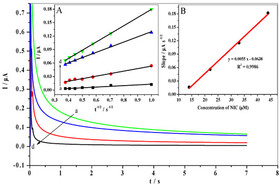 Chronoamperograms were obtained at the GO/Nq/GCE in 0.1 M of Na2SO4(pH 8.0) for different concentrations of NIC (a to d: 14, 22, 33, and 44 µM). Insets: (A) a plot of I vs. t−1/2, the (B) plot of the slope of straight lines vs. NIC concentration.