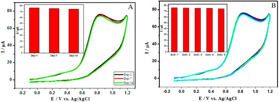 The viability of the GO/Nq/GCE could be evaluated by their stability and reproducibility towards the NIC determination. Therefore, Figure 13A shows the CVs of 3.5 mM NIC in 0.10 M Na2SO4 (pH 8.0) for 14 days, while the modified electrode was kept at 25 °C. The results indicate no significant change in the peak potential, and the peak current remains at 97.71% of its initial current response. Additionally, Figure 13B shows the reproducibility of the GO/Nq/GCE, taking five repetitive CVs’ measurements via the same optimized protocol. It was concluded that the relative standard deviation of RSD = 0.80% in peak current. The results indicated that the fabricated electrode exhibited good stability and high reproducibility.