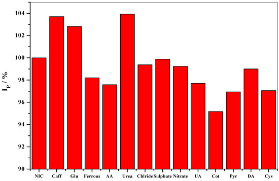 An important parameter for a developed electrode is its selectivity towards the target analyte. The influence of some possible interferences on the determination of 3.5 mM NIC in 0.1 M Na2SO4 (pH 8.0) at the GO/Nq/GCE was examined. The tolerance limit was calculated as less than 5% of the relative error in this study. Figure 14 represents the results investigated from the current changes comparing the peak current of NIC only and the signal of NIC with the interfering substances. It is clear that 1000-fold concentration ratios of Na+, K+, Fe2+, Cl−, NO3−, and SO42−, 100-fold concentration ratios of glucose and L-cysteine, and 5-fold concentration ratios of pyridine, dopamine, ascorbic acid, and uric acid did not interfere with the measurement of NIC. Additionally, there is no significant variation in the current response after adding 50-fold concentration ratios of urea, caffeine, and cotinine, a primary metabolite of NIC. These results prove the excellent selectivity of the developed sensor for the electrochemical determination of NIC in presences of other interferences.