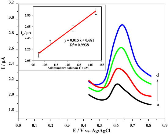 DPVs were recorded at the GO/Nq/GCE upon the addition of known concentrations of NIC (a to d: 100, 110, 130, and 150 µM) in 0.1 M of Na2SO4 (pH 8.0) with a scan rate of 100 mV/s. Inset shows the corresponding calibration curve.