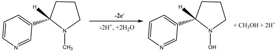 where α is (the electron transfer coefficient) and n (refers to number of electrons). The calculated number of electrons were found to be (2.1). That is mean two electron was participated in the oxidation process of NIC. So the expected mechanism (Scheme 2) for the oxidation of NIC at the GO/Nq/GCE in alkaline media which involves substitution of CH3 group by OH at the nitrogen of pyrrolidine ring with formation of methanol by two protons and two electrons transfer [5,59].