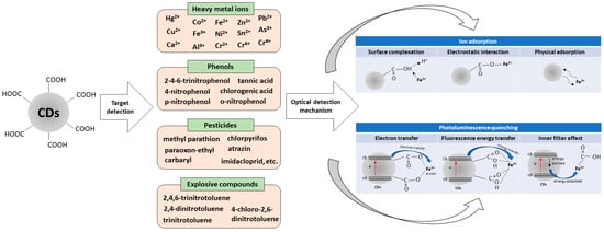 To date, many review articles on the preparation of CDs, heteroatom doped CDs, and their applications have been published [,,,]. However, there is no comprehensive review exploring various green and chemical precursors as the carbon source in CDs and their application in environmental monitoring. The purpose of this review is, therefore, to update and organize the green and chemical precursors used in CD preparation. The final section will give a concise overview of their application in the optical sensing of heavy metal ions, phenol, pesticides, and nitroaromatic explosives.