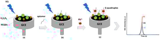 - Li, D.; Chen, C.; Guo, X.; Liu, C.; Yang, W. A Simple Electrochemiluminesecence Aptasenor Using a GCE/NCQDs/Aptamers for Detection of Pb. Environ. Technol. 2021, 43, 2270–2277. [Google Scholar] [CrossRef]