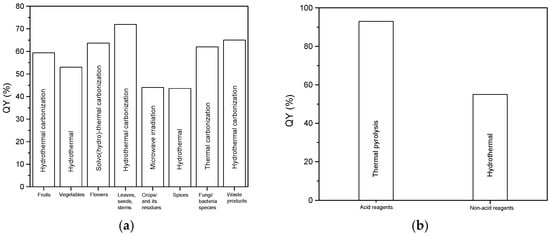 The conversion of fungi/bacteria species into a value-added product such as carbonaceous nanomaterials has contributed to the green and sustainable improvement. Algal blooms [], yogurt [], enokitake mushroom [], microalgae biochar [], mushroom [], agarose waste [], and Shewanella oneidensis [] have been previously chosen as a carbon resource (Table 6). A study conducted by Pacquiao et al. (2018) demonstrated the increment of quantum yield of 11% to 39% upon passivation with tetraethylenepentamine in the presence of 5% v/v sulfuric acid []. The XPS spectrum revealed the presence of small signals of nitrogen and sulfur at 399 eV (N1s) and 168 eV (S2p), respectively, thus confirming the successful heteroatoms doping on CDs and sulfuric acid as a reagent. Furthermore, the effect of temperatures (180, 200, and 250 °C) and reaction times (4, 6, and 8 h) on the quantum yield was evaluated, yielding the optimum temperature and reaction time at 250 °C for 4 h. The research, thus, concluded that higher temperatures and shorter reaction times can produce higher quantum yields. Even so, CDs prepared from agarose waste-derived CDs without using other passivation chemicals exhibited the highest quantum yield of 62% []. This quantum efficiency can be attributed to the presence of different functional groups (–C=O, –OH, and N–H) on the surface of CDs, in addition to being related to the surface defects and the particle size of CDs.