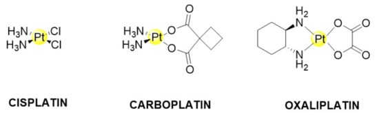 Cancer is one of the leading causes of death worldwide [1,2], and it is frequently caused by many factors, including genetic variables, physical and chemical insults and lifestyle habits, such as poor diet or smoking [3,4]. It has been widely studied based on its epidemiology and mechanism, with the main therapies adopted to date based on various surgeries, chemotherapy and radiotherapy, as well as relatively new strategies, such as immune or gene therapies. Following surgical removal, chemotherapy is the most common treatment strategy, as it is based on the use of specific molecules targeting the high cancer cell proliferation rate, interfering with their metabolism [5]. Among chemotherapeutic agents, platinum(II)-based compounds are the most successful, and three compounds, i.e., cisplatin, carboplatin and oxaliplatin, are used worldwide to cure several cancer types (Figure 1) [6,7].