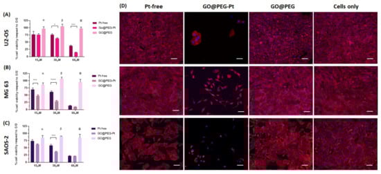 Cell viability and morphological analysis in osteosarcoma cell lines. An MTT assay was performed after 72 h of cell culture. The data show the percentage of viable cells compared to cells alone as the control, and the mean ± standard error of the mean is presented. The graphs show the viability of the U2-OS cell line (A), the MG63 cell line (B), the SAOS-2 cell line (C) and the respective morphological images of the cells cultured for 72 h in the presence of the 30 mM concentration. Phalloidin red stains for actin filaments, and DAPI blue stains for cell nuclei (D). Scale bars: 100 µm. (* p-value ≤ 0.05; *** p-value ≤ 0.001; **** p-value ≤ 0.0001). Significant differences between GO@PEG and the other compounds are reported in the graph as follows: a: GO@PEG vs. Pt-free; p-value ≤ 0.01 and GO@PEG vs. GO@PEG-Pt p-value ≤ 0.001 in U2-OS; GO@PEG vs. Pt-free p-value ≤ 0.01 and GO@PEG vs GO@PEG-Pt p-value ≤ 0.0001 in MG63; GO@PEG vs. Pt-free p-value ≤ 0.05 and GO@PEG vs GO@PEG-Pt p-value ≤ 0.001 in SAOS-2. b and F: GO@PEG vs Pt-free and GO@PEG vs. GO@PEG-Pt both p-value ≤ 0.0001 in all cell lines.