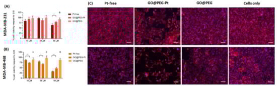 Cell viability and morphological analysis in breast adenocarcinoma cell lines. An MTT assay was performed after 72 h of cell culture. The data show the percentage of viable cells compared to cells alone as the control, and the mean ± standard error of the mean is presented. The graphs show the viability of the MDA-MB-231 cell line (A), the MDA-MB 468 cell line (B) and the respective morphological images of the cells cultured for 72 h in the presence of the 30 mM concentration. Phalloidin red stains for actin filaments, and DAPI blue stains for cell nuclei (C). Scale bars: 100 µm. (* p-value ≤ 0.05, *** p-value ≤ 0.001). Significant differences between GO@PEG and the other compounds are reported in the graph as follows, a: GO@PEG vs. GO@PEG-Pt p-value ≤ 0.05 in MDA-MB 468. b: GO@PEG vs. Pt-free p-value ≤ 0.01 and GO@PEG vs. GO@PEG-Pt p-value ≤ 0.0001 in MDA-MB 468. F: GO@PEG vs. Pt-free p-value ≤ 0.001 in MDA-MB 231, GO@PEG vs. Pt-free and GO@PEG vs. GO@PEG-Pt both p-value ≤ 0.0001 in MDA-MB 468.
