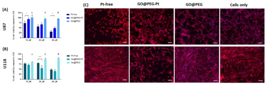 Cell viability and morphological analysis in glioblastoma cell lines. An MTT assay was performed after 72 h of cell culture. The data show the percentage of viable cells compared to cells alone as the control, and the mean ± standard error of the mean is presented. The graphs show the viability of the U87 cell line (A), the U118 cell line (B) and the respective morphological images of the cells cultured for 72 h in the presence of the 30 mM concentration. Phalloidin red stains for actin filaments, and DAPI blue stains for cell nuclei (C). Scale bars: 100 µm. (* p-value ≤ 0.05; ** p-value ≤ 0.01). Significant differences between GO@PEG and the other compounds are reported in the graph as follows, a: GO@PEG vs. Pt-free p-value ≤ 0.01 in U87; GO@PEG vs. GO@PEG-Pt p-value ≤ 0.05 in U118. b: GO@PEG vs. Pt-free p-value ≤ 0.0001 and GO@PEG vs. GO@PEG-Pt p-value ≤ 0.01 in U87, GO@PEG vs. Pt-free p-value ≤ 0.01 and GO@PEG vs. GO@PEG-Pt p-value ≤ 0.0001 in U118. F: GO@PEG vs. Pt-free p-value ≤ 0.0001 and GO@PEG vs. GO@PEG-Pt p-value ≤ 0.001 in U87, GO@PEG vs. Pt-free p-value ≤ 0.0001 and GO@PEG vs. GO@PEG-Pt p-value ≤ 0.0001 in U118.