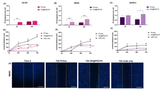 Human osteosarcoma cell lines: ICP-OES on U2-OS (A), MG63 (B) and SAOS-2 (C). Scratch test on U2-OS (D), MG63 (E) and SAOS-2 (F). α: Pt-free vs. cells only and GO@PEG-Pt vs. cells only, both p values ≤ 0.0001 in U2-OS; Pt-free vs. cells only. p value ≤ 0.0001 in SAOS-2. β: Pt-free vs. cells only and GO@PEG-Pt vs. cells only, both p values ≤ 0.0001 in U2-OS; Pt-free vs. cells only, p value ≤ 0.01, and GO@PEG-Pt vs. cells only, p value ≤ 0.0001 in MG63; Pt-free vs. cells only and GO@PEG-Pt vs. cells only, both p values ≤ 0.0001 in SAOS-2. φ: Pt-free vs. cells only and GO@PEG-Pt vs. cells only both, p value ≤ 0.0001 in U2-OS, MG63 and SAOS-2. Significant differences between Pt-free and GO@PEG-Pt are reported in the graph as follows: * p-value ≤ 0.05, *** p-value ≤ 0.001, **** p-value ≤ 0.0001. Representative DAPI staining of scratch test on MG63 cells (G) cells. Scale bars = 500 µm. Cell nuclei are indicated in blue.