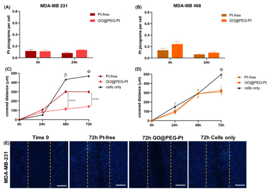 Human breast adenocarcinoma cell lines. ICP-OES on MDA-MB-231 (A) and MDA-MB-468 (B). Scratch test on MDA-MB-231 (C) and MDA-MB-468 (D); β: Pt-free vs. cells alone and GO@PEG-Pt vs. cells alone, both p values ≤ 0.0001 in MDA-MB 231. φ: Pt-free vs. cells alone and GO@PEG-Pt vs. cells alone, both p values ≤ 0.0001 in MDA-MB 231; Pt-free vs. cells alone, p value ≤ 0.0001, and GO@PEG-Pt vs. cells alone, p value ≤ 0.001 in MDA-MB 468. Significant differences between Pt-free and GO@PEG-Pt are reported in the graph as follows: **** p-value ≤ 0.0001. Representative DAPI staining of scratch test on MDA-MB-231 cells (E). Scale bars = 500 µm. Cell nuclei are indicated in blue.