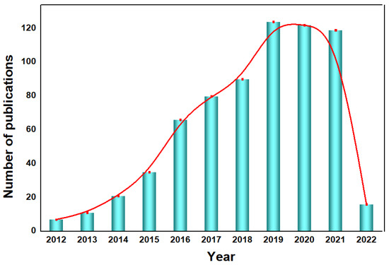 Year-by-year publications of g−CN research on PEC devices, the keywords were set to [“graphitic carbon nitride” and “photoelectrochemical”] (The red line is the trend line). Data are obtained from the ISI Web of Science, dated 17 April 2022.