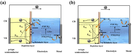 Gaining an elementary understanding of photoelectrochemical, charge-separation, and transfer mechanisms is the crucial step in designing photoelectrodes. Figure 2 show structural diagrams of the general photoelectrocatalytic processes for PEC water splitting. There are three primary components of a typical PEC device: (1) a working electrode consists of semiconductor material, a p-type semiconductor as a photocathode (Figure 2a), and an n-type semiconductor as a photoanode (Figure 2b), (2) a counter electrode, and (3) an electrolyte system. It will facilitate the transport of electrons and holes and ensure the separation of hydrogen and oxygen produced on different electrode surfaces. Before contact with the electrolyte, the energy level in the semiconductor is flat. Once in contact with the electrolyte, the different chemical potentials will drive the charge in the semiconductor to the electrolyte until the formation of the built-in electric field. Then, a depletion layer (WD) and a Helmholtz layer (WHL) present at the semiconductor interface and the electrolyte interface, respectively, to form a semiconductor–liquid junction (SCLJ). This charge transfer also gives rise to band bending at the semiconductor interface. For the n-type semiconductors, electrons flow from the semiconductor conduction band to the electrolyte, and the semiconductor surface forms a positively charged depletion layer, resulting in the upward band bending. In contrast, holes flow from the semiconductor to the electrolyte for the p-type semiconductors, which leads to the downward band bending.