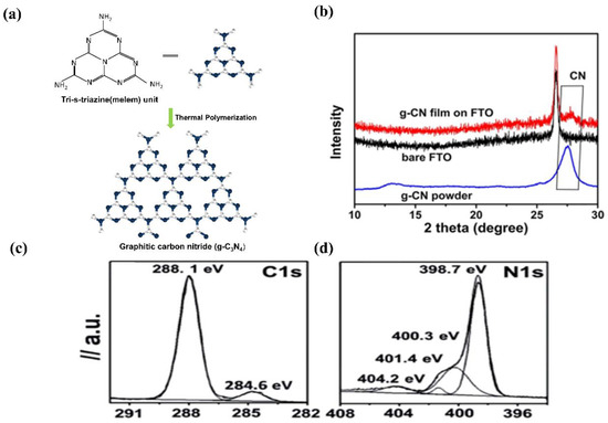 (a) Schematic structure of a g−CN constructed from tri-s-triazine units. (b) XRD pattern of g−CN film. Reprinted with permission from ref. [34] Copyright 2015 Wiley-VCH. (c,d) XPS high-resolution spectra of the C1s and N1s core energy spectra of g−CN film. Reprinted with permission from ref. [36] Copyright 2012 Elsevier.