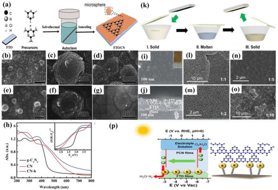 Using the solvothermal method with post-annealing, g−CN films can be grown on different substrates, such as FTO [57,58], glass [58], and TiO2/FTO [58]. Xie et al. fabricated g−CN films on FTO via simply dissolving cyanuric chloride and melamine in acetonitrile, as described in Figure 6a. The solutions were maintained at 180 °C for 24 h, and the g−CN film followed the Stranski–Krastanov growth mode. A transition from the two-dimensional layer-by-layer mode (shorter than 12 h) to three-dimensional micro-spheres stacking mode was observed owing to the changes in the surface energy of substrates and the properties of solutions. However, this process can hardly form a complete tri-s-triazine structure g−CN film because of insufficient kinetic energy. An annealing process, annealed in N2 at 520 °C for 1 h, for example, plays a key role in forming a tri-s-triazine structure. The interfaces of microspheres and nanoparticles become vague after a post-annealing treatment, manifesting the thermal cross-linking and condensation sequentially (Figure 6b–g). The obtained g−CN films showed higher activity in PEC performance of this technique, with photocurrent densities of 3.5 μA cm−2 at 1.23 V vs. NHE produced, compared with traditional paste-prepared g−CN. The improvement was mainly attributed to the following two factors. Firstly, the presence of covalent linkage between g−CN and the substrate generates synergistic effects. Secondly, a red shift from approximately 460 nm to 620 nm is accompanied by the diminished band gap of 2.0 eV, narrower than the 2.7 eV of the conventional g−CN (Figure 6h) [57].