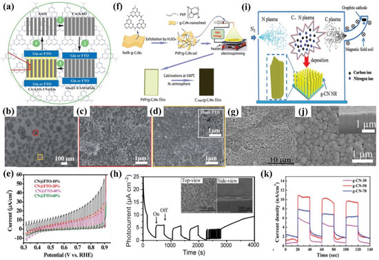 Electrospinning as a practicably proven method is also used to fabricate the PEC photoanode, in which the ITO substrate is coated with prepared polyvinylpyrrolidone (PVP)/g−CN sol and annealed at 500 °C. The thickness of the films can be modulated by varying the electrospinning time and actually controlling the PEC performance. Furthermore, the photoelectrode demonstrates a stable photocurrent performance (6.64 μA cm−2) for 4000 s with no degradation (Figure 8f–h) [77]. Wang et al. developed a vacuum magnetic filtered arc ion plating (VMFAIP) approach, in which the carbon plasma emitted from a graphite cathode was deflected by a magnetic field and combined with N2 to generate C–N compound on the FTO substrate. The resulting g−CN nanorod (NR) arrays eliminated the intralayer hydrogen bonds owing to the utilization of carbon and nitrogen sources alone. The change of the graphite target current allowed different lengths of the g−CN nanorod arrays from 550 nm to 1.1 µm. The gas-based approach via the VMFAIP system enabled the g−CN to form heterostructures easily with, including but not limited to, TiO2 nanorod arrays (Figure 8i–k) [93]. Ladva et al. [94] synthesized g−CN thin films with a bandgap of approximately 1.73 eV by an ionothermal (molten salt) approach using dicyandiamide, KBr, and LiBr mixture precursors. Lou et al. [96] demonstrated a g−CN layer on the substrate by embedding g−CN in a matrix conductive polymer binder (PEDOT-PSS [96,97,98], Nafion [57,99,100], and others) [101]. Compared with Nafion, the g−CN film blended by PEDOT-PSS showed superior PEC activities because the PEDOT-PSS binder is a wonderful conducting polymer and can act as a hole-transport layer. Recently, Tejasvi et al. [95] synthesized stoichiometric g−CN thin films by radio frequency magnetron sputtering using a g−CN pellet as a target. Thin-film samples can be deposited on the borosilicate glass and TiO2 nanotube array in Ar and N2 plasma media. The PEC studies summarized that the g−CN/TiO2 formed under Ar plasma (~290 μA/cm2 at 0.9 V) obtained a higher current density as compared to that under N2 plasma (~160 μA/cm2 at 0.9 V).