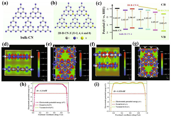 In addition, a novel two-step surface boron decoration of g−CN is currently gaining attention as this approach shows active influences on the structural and optical properties [111]. The strong van der Waals force attractions between sp2 carbon atoms make g−CN poorly dispersible in an aqueous solution, and the strong hydrophilicity is key to ensuring the full development of g−CN-based materials in an aqueous medium. A structure of hydrophilic and high surface area assembled by two-dimensional B-doped g−CN has been successfully prepared to effectively control the band gap and charge separation (Figure 10a–c). The electron density difference (EDD) map and work function results show that B-doped g−CN has a higher distribution of electron density (Figure 10d–g), and a larger work function makes a higher degree of band bending, leading to the rapid transfer of electrons, and thus improving the PEC capability (Figure 10h,i) [112].