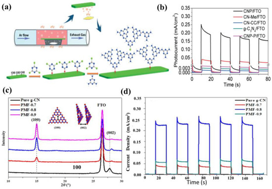 (a) Schematic illustration of the synthesis of the g−CN film with a triazine–heptazine network, and (b) photocurrent (i–t curve) of g−CN film chopping in 0.5 M Na2SO4 under simulated solar irradiation. Reprinted with permission from ref. [130] Copyright 2019 Royal Society of Chemistry. (c) XRD patterns of pure g−CN and tailored films, and (d) transient photocurrent response in 0.2 M Na2SO4 at 1.23 V vs. RHE. Reprinted with permission from ref. [131] Copyright 2018 Wiley-VCH.