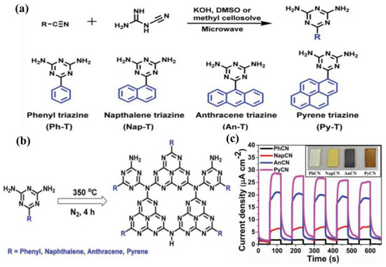 (a) Synthesis diagram of polycyclic aromatic triazines and their different molecular structures. (b) Self-condensation of the corresponding monomers. (c) The photocurrent measurements of polycyclic aromatic hydrocarbons modified CNs (PAH-CN) drop-casted electrodes at 1.23 V vs. RHE (the inset shows the photographs of g−CN dissolved in tetrahydrofuran (THF) and drop-casted on FTO). Reprinted with permission from ref. [133] Copyright 2019 Wiley-Blackwell.