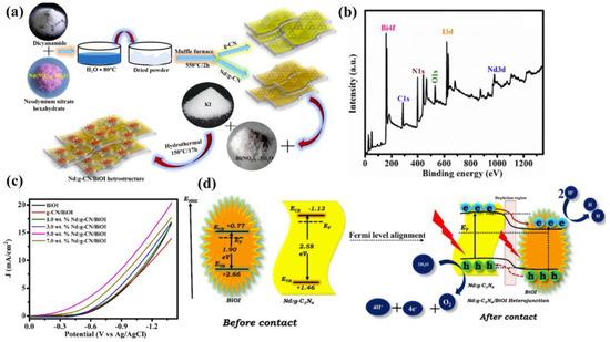 - Velusamy, P.; Sathiya, M.; Liu, Y.; Liu, S.; Ramesh Babu, R.; Aly Saad Aly, M.; Xing, R. Investigating the effect of Nd3+ dopant and the formation of g-C3N4/BiOI heterostructure on the microstructural, optical and photoelectrocatalytic properties of g-C3N4. Appl. Surf. Sci. 2021, 561, 150082. [Google Scholar] [CrossRef]