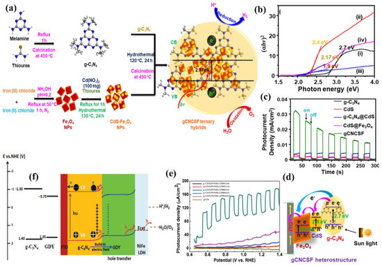 - Liu, C.; Qiu, Y.; Zhang, J.; Liang, Q.; Mitsuzaki, N.; Chen, Z. Construction of CdS quantum dots modified g-C3N4/ZnO heterostructured photoanode for efficient photoelectrochemical water splitting. J. Photochem. Photobiol., A. 2019, 371, 109–117. [Google Scholar] [CrossRef]