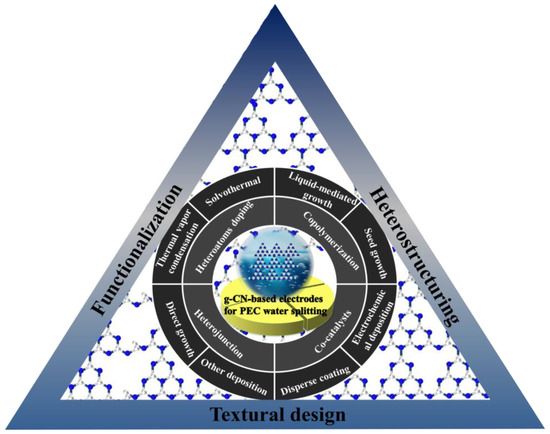 Up to now, several insightful reviews have already focused on the fabrication and modification of the bulk or powder g−CN and their applications in dealing with the energy crisis and environmental problems [3,22]. However, only a handful of reviews can be traced that focused on the synthesis and applications of g−CN films for PEC water splitting. This scenario thus makes it very urgent to offer a critical and relatively comprehensive review of the state-of-the-art advances of g−CN films for PEC water splitting. In the present review, we initially focus on the latest advances in the fabrication, versatile properties, rational modification, and applications of g−CN-based films for PEC water splitting. Firstly, this review will conclude the different types of g−CN photoelectrodes according to their preparation pathways and then the rational modification methods to promote the PEC performance. Last but not least, the major challenges and some invigorating perspectives for future research on g−CN-based film materials are also concluded. We hope that this review will not only offer valuable insight into new g−CN-based film materials but also therefore promote the further developments of g−CN-based films in green and sustainable energy production and storage.