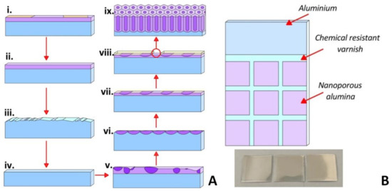 Scheme of the PAA fabrication process using two-step anodization for an ordered PAA formation (A); schematic view and Al substrate image for the PAA membranes obtaining (B).