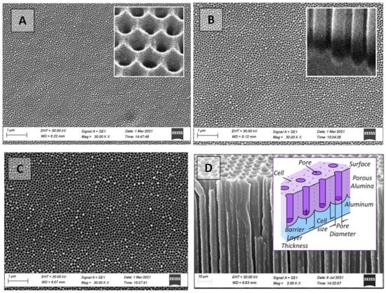 SEM images of the top view (outer surface) of as-fabricated PAA membranes with a size of 15 mm × 15 mm: (A)—40 V, (B)—50 V, (C)—60 V, (D)—PAA cross-section. The insets show enlarged images of the surface (A) and the bottom part of the PAA cross-section (B); and a schematic cross-section view of the PAA (D).