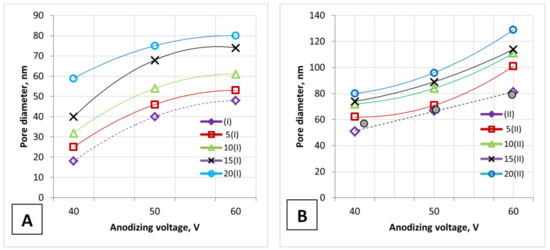 The anodizing voltage influence on the PAA pore diameter: (A)—one-stage anodizing and (B)—two-stage anodizing. The calculated values are shown as shaded circles.