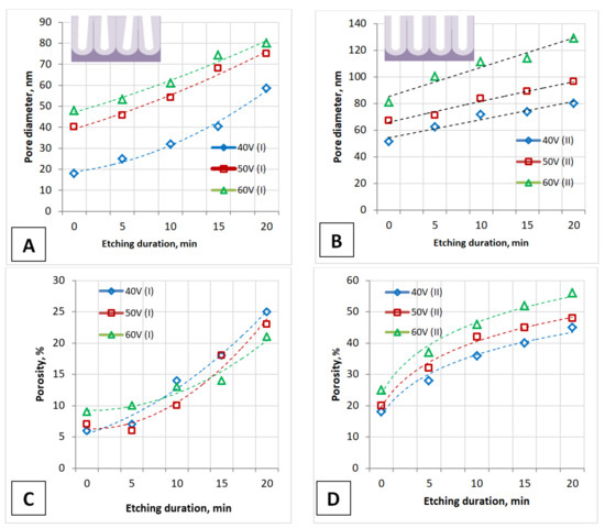 The calculated values (shaded circles, Figure 3B) almost correspond to the experimental values for an unetched PAA surface (as-fabricated sample, before etching) for the II type of samples. Only the experimentally obtained pore diameter of the I type samples (Samples No. 1, 2, 3) and the experimental porosity of the II type samples (Samples No. 4 and 6) differ from the calculated values. This is due to the fact that the calculation equations are obtained for densely packed, highly arranged, hexagonal PAA cells, and each solitary pore is assumed to be a perfect circle. Figure 4 presents the influence of the main parameters of PAA on the pore diameter and porosity of the PAA during one- and two-stage anodizing.