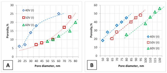 Dependence of the PAA porosity during one-stage (A) and two-stage (B) anodizing on the pore diameter and voltage.