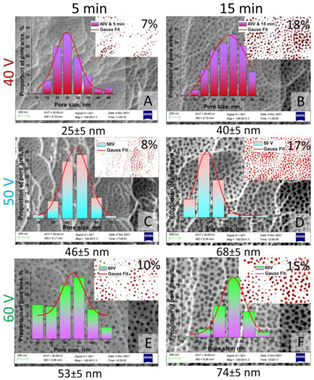 The pore size, diameter, length, and porosity were determined using SmartSEM software. Figure 6 and Figure 7 represent the results of statistical analysis of the main morphological parameters of the samples for both types of samples: SEM images, porosity, bar graph, and contrast images. Inserts (red with white) in Figure 6 and Figure 7 show the contrast SEM images of porosity (in %).