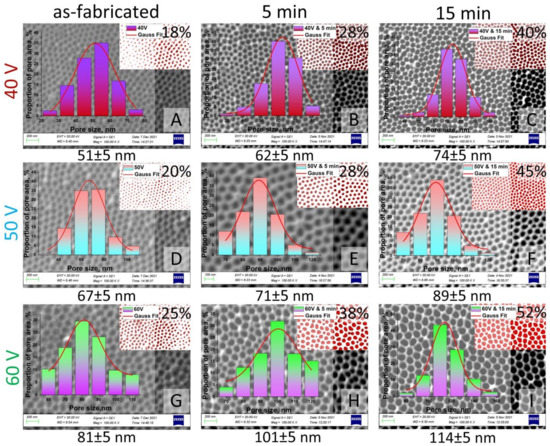 Moreover, the pore density, Pp, was calculated by equation Pp = [31] to be approximately 1010 per cm2: 1.16 × 1010 (40 V); 0.7 × 1010 (50 V); 0.45 × 1010 (60 V).