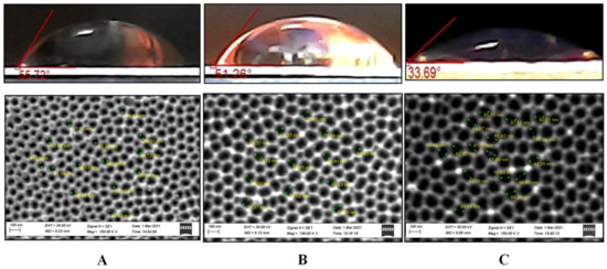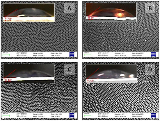 As a consequence, PAA membranes with a well-ordered structure and 3 µm (40 V), 3.3 µm (50 V), and 3.6 µm (60 V) thicknesses with different pore diameters have been obtained (Figure 2). It was shown in [41,53] that when the thickness of as-fabricated PAA is less than 1.7 µm, the surface morphology is the only significant factor determining the value of the contact angle, which was also verified by our experimental results for as-fabricated PAA with a small thickness of 3–3.6 µm.