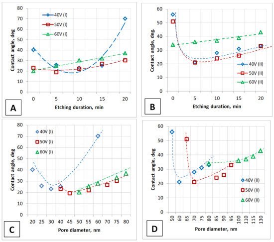 The dependence of the contact angle on the PAA pore diameter and etching duration of the barrier layer obtained during one-stage (A,C) and two-stage (B,D) anodizing after chemical modification (after 1 min the water drop applying).