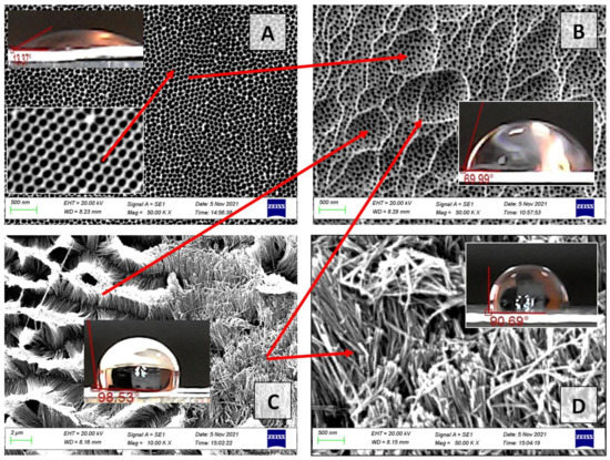 In principle, wetting behavior can be changed from the Wenzel’s model (which describes the homogeneous wetting regime) to the Cassie–Baxter model (which describes the heterogonous wetting mode, which is more complex) by changing only the surface morphology [40,43,44]. In particular, an artificially unmodified PAA surface, consisting of a porous layer and hierarchical nanostructures in the form of, for example, nanowires, nanopillars, or pyramids, etc., demonstrates both superhydrophobicity and superoleophilicity, which can be used in water-proof or self-cleaning surfaces, functional microfluidics devices, and water separation, etc. The aim of this work is to propose a new approach for the design of functional surfaces with tunable wettability properties.